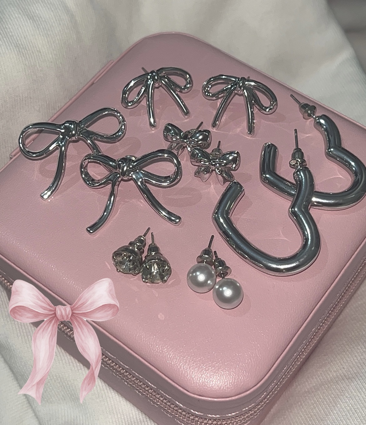 گوشواره میخ نقره پاپیون صورتی پاستلی